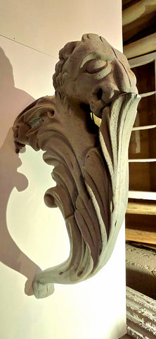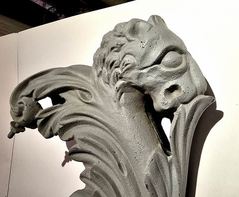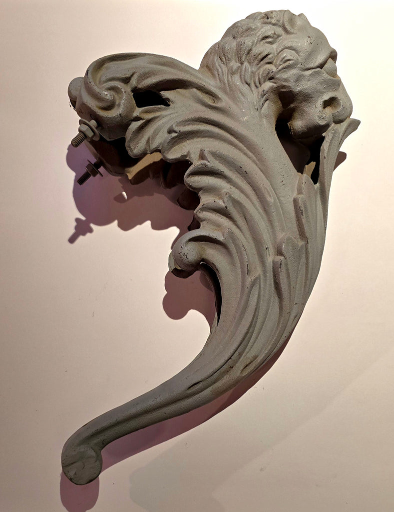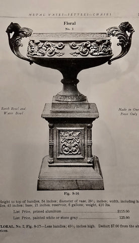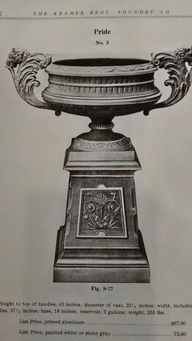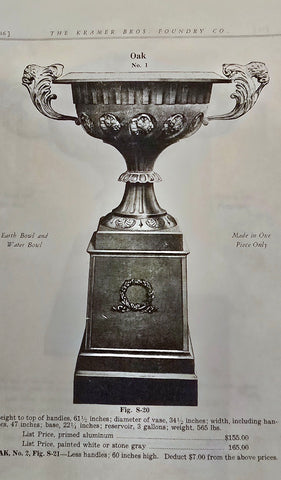 We have 2 pair off these original cast iron urn handles from the late 1800s made by Kramer Bros Foundry from Dayton Ohio. Measuring 16" high. They were used in the following urns: Floral, Oak, Pride & Gem ( shown from our KB catalog reprint). Sold in pairs only. They have been primed and ready for paint. Please contact us with any questions. Shipping available. Pair weighs 24lbs w/o packing. Please contact us for a shipping quote.