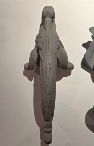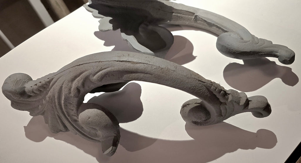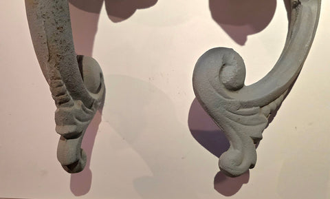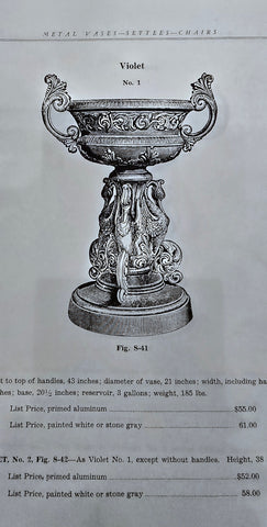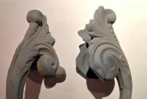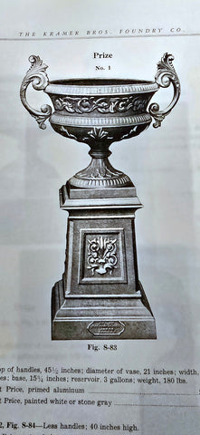 We have 1 pair of these original cast iron urn handles in this pattern for a Prize or Violet urn cast by Kramer Bros Foundry in Dayton. They're are part leaf, pay scroll. Unfortunately KB never named their handles only their urns (s far as we know & they are not identified in their catalog). These measure 14½" h x 5" w and weigh 15lbs for the pair. We do have 1 single handle that we cast in aluminum that is 4lbs at 175.00. These have been primed and are ready to paint. Please contact us with any questions. shipping available.