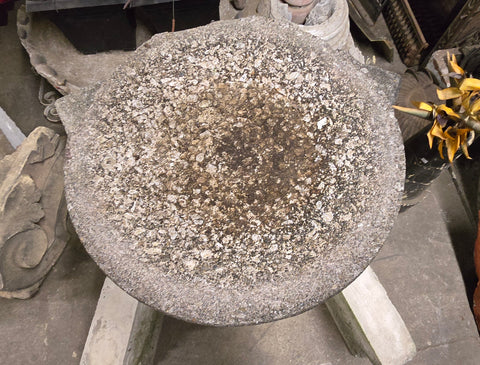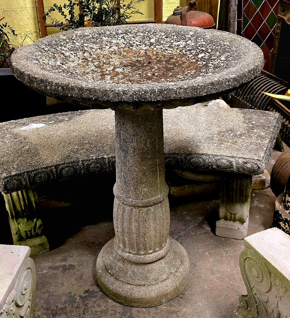 Great patina on this old cast stone birdbath. There is some wear & tear on this old piece. 35"h x 27" diameter bowl. Please contact us with any questions. Shipping available.. Please contact us for a s/h if needed.