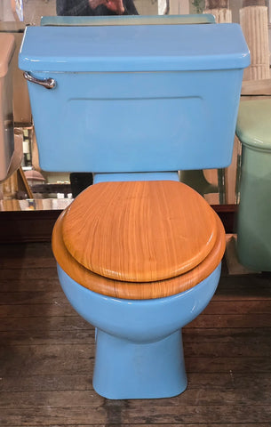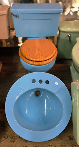 One of our vintage Kohler toilets in stock. This "Wellworth" model is in bright New Orleans Blue. 12" rough, round bowl. We have a matching round "Brookline" sink (325.00) available as well to create a great MCM bathroom! Please contact us with any questions. Shipping available or in store pick up available.