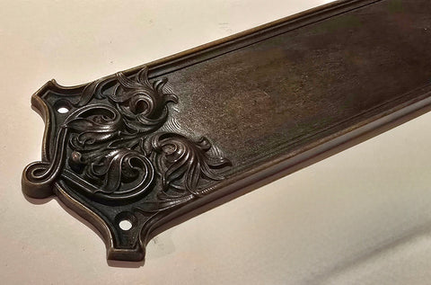 1905 cast bronze swing door push plate by Corbin in the Marburg pattern. What great designs Corbin produced. Unfortunately we only have one of these beauties. Nice size at about 12". Please contact us for other push plate options in stock. Shipping available available on all our items. 65k pieces of door hardware in stock.