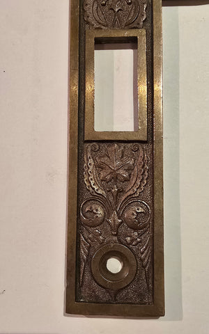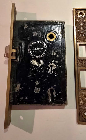 What a beautiful entry mortise and strike! It's a double skeleton key mortise by R&E (Russell Erwin) Hardware Co. This originally went with their Hummingbird pattern. It is for a right swing door. Measuring: edge plate 9⅛" x 1 15/16", backset is 3⅛", strike is 9⅛" x 1¼". We can get it keyed as well. Edge plate and strike are beautifully detailed bronze castings. Please contact us with any questions.