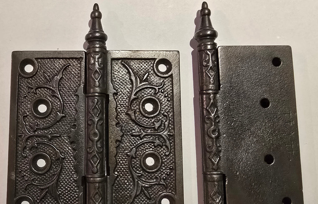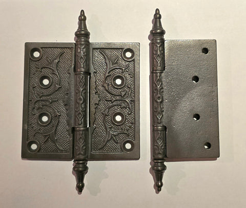 Here's a pair of decorative cast iron 4½" x 4½" steeple top hinges. Contact us for me hinge options. Shipping available. Not reproductions.