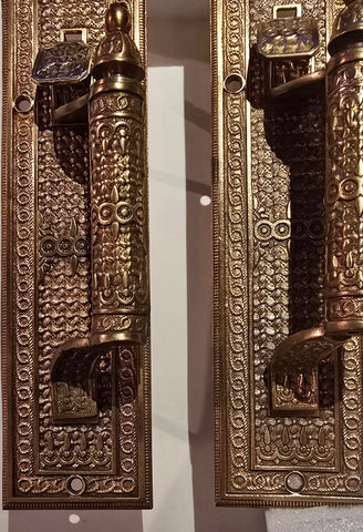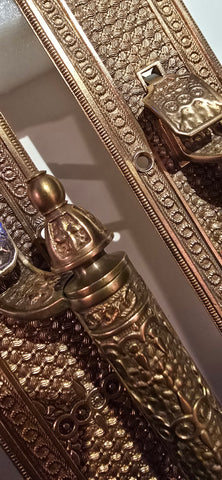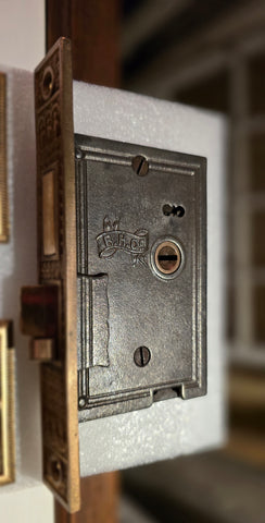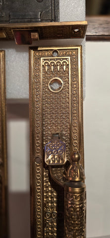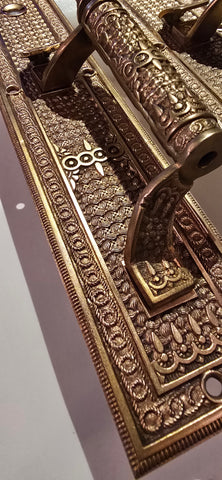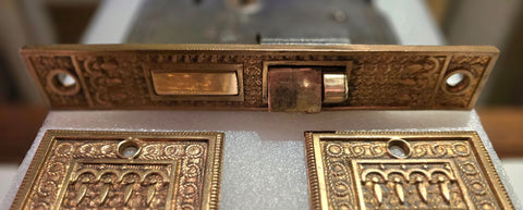 A beautifully detailed antique entry door cast Bronze Thumb Paddle Set by Reading Hardware Co. The detailing is exquisite. The pulls measure 13¼" x 2 ¾". The mortise has a 2" backset and an edge plate that measures 7" x 1⅛"...all with jewelry like precision. Please contact us with any questions.