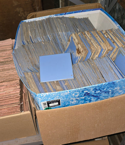 We have a quantity of these retro MCM bathroom plastic wall tiles available in this medium blue color. Popular in the 50s. Made by the Tile-Rite...DeLuxe Plastic Wall Tile from Cleveland OH. We also have a quantity of pink as well. Please contact us with any questions. Shipping available.