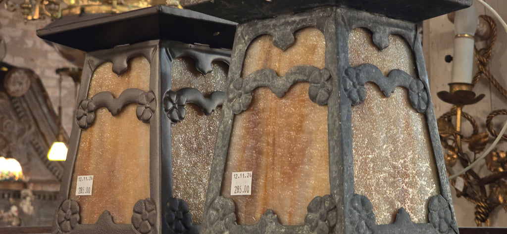 We have a pair of these cool porch light available (front and back porch). They are stamped steel with Carmel/ White at glass... rewired as well. 7"h x 6"sq at to x 5¼"sq at bottom. Sold separately. Please contact us with any questions or for a shipping quote.