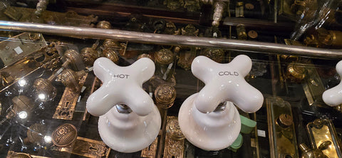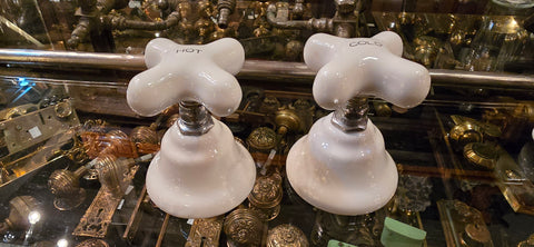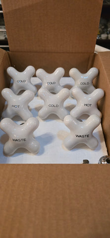 Vintage porcelain sets for Standard sinks or tubs. Each sells separately @ 55.00 (includes cross handle and escutcheon w/metal tub for stem). 2 Hots, 2 Wastes, 4 Colds. If you have a sink or a tub that takes a waste set as well, these will work. Contact us with any questions. We do have other styles, mfg available.
